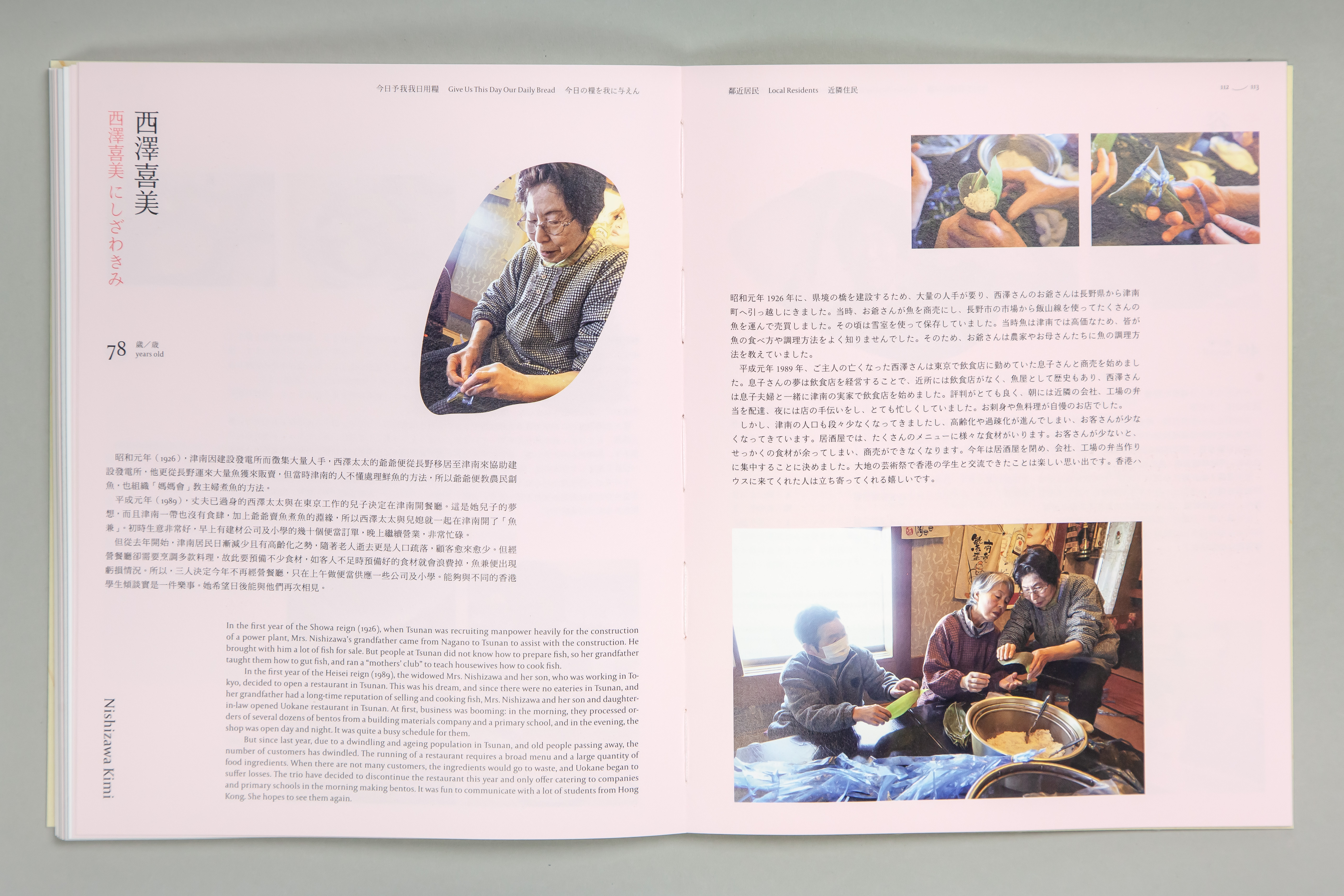Give Us This Day Our Daily Bread follows the journey of the project, including the exploration, interviews, ceramics works, illustrations, and a dining party with Tsunan residents. The book is designed to accommodate trilingual content in Japanese, English, and Traditional Chinese through carefully arranged typography. Overall, this book offers a thought-provoking look at the intersection of food, culture, and identity.